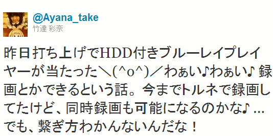 昨日打ち上げでHDD付きブルーレイプレイヤーが当たった\(^o^)/わぁい♪わぁい♪ 録画とかできるという話。 今までトルネで録画してたけど、同時録画も可能になるのかな♪ …でも、繋ぎ方わかんないんだな!