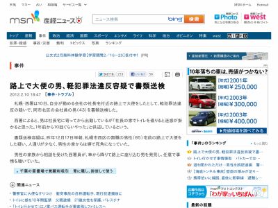 書類送検容疑は、昨年12月17日早朝、札幌市西区の無職の男性(85)宅前の路上で大便をした疑い。人通りが少なく、男性の家からは塀で死角になっていた。
