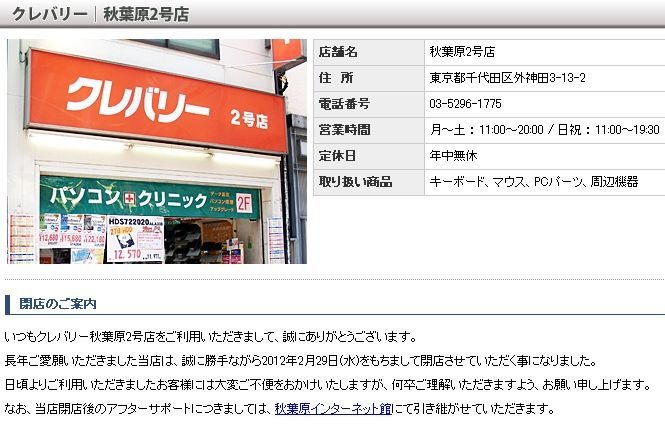 いつもクレバリー秋葉原2号店をご利用いただきまして、誠にありがとうございます。