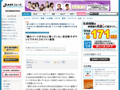 日曜ゴールデンタイムのテレビ番組で、「国民的アイドルグループ」AKB48の前田敦子さん(20)の顔がネタにされた。「顔面のパーツが中心に寄っている」という内容で、AKBファンを中心にネットで話題になっている。
