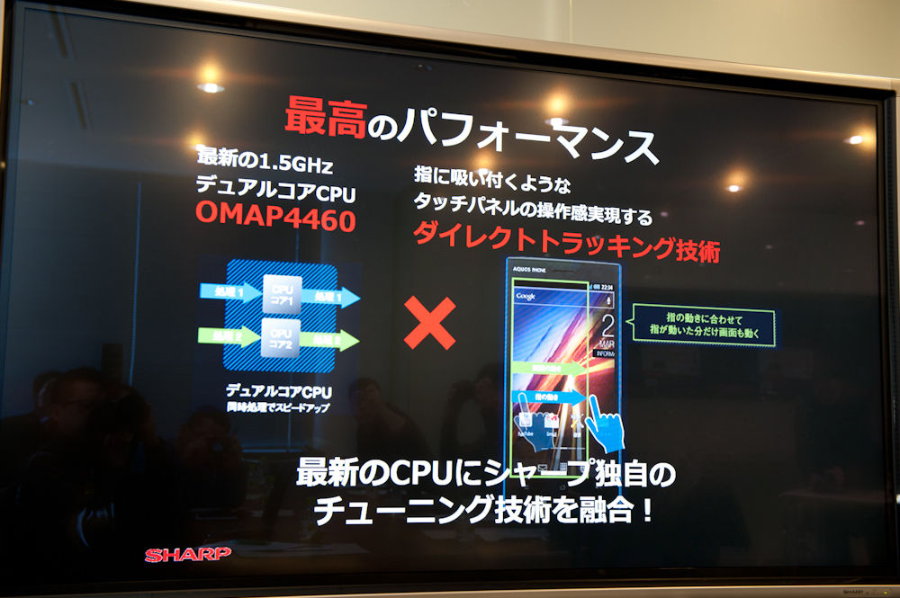 具体的には、デュアルコアCPUのTI製「OMAP4460」は、既存モデルでは最高レベルとなる1.5GHz駆動で搭載され、これにシャープ独自の「ダイレクトトラッキング技術」が組み合わされる。「ダイレクトトラッキング技術」とは、タッチ操作による指の移動量と、指の動きに画面が反応するまでの時間を数値化し、ハードウェア、ソフトウェアの双方をチューニングすることで最適化を図るというもので、タッチ操作全般に影響するチューニング技術。