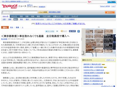 東京都教育委員会が、1、2年生時に必要な単位が取れなくても進級する「単位制の考え方を取り入れた高校制度」を、16年度をめどに導入する方向で検討していることが分かった。
