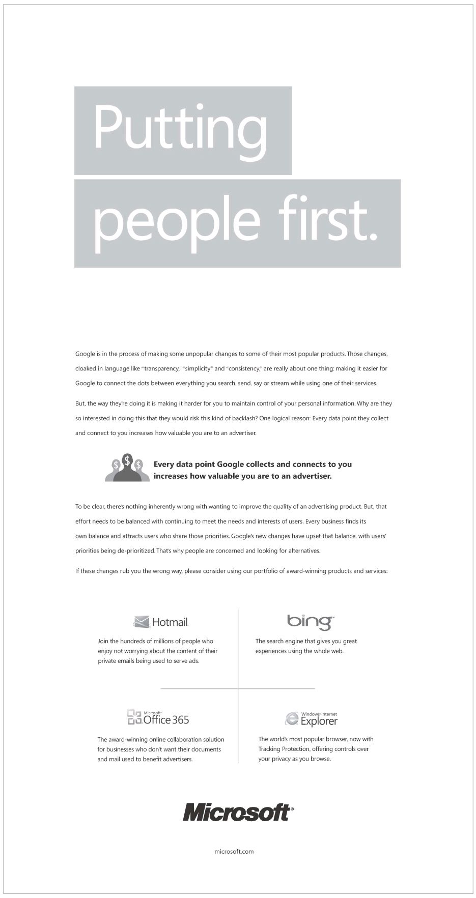 Microsoftは「Googleの更新は、人々が自分の情報を管理することを従来より難しくする。Microsoftは違うアプローチをとっている」とし、Microsoftのサービスは安全で、ユーザーデータをユーザーのHDDにもクラウド上にも保存できる選択肢を提供していると主張する。