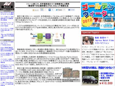 東京工業大学とソニーは20日、世界最高速という6.3Gb/sのミリ波無線データ伝送を実現する高周波LSI、およびベースバンドLSIを共同開発したと発表した。モバイル機器間での高速なワイヤレスにデータを送受信したり、高画質な映像を非圧縮で転送・視聴できるようになるという。