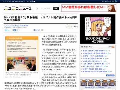 NHKで「初音ミク」の緊急番組が放送されることが2012年2月10日、わかった。