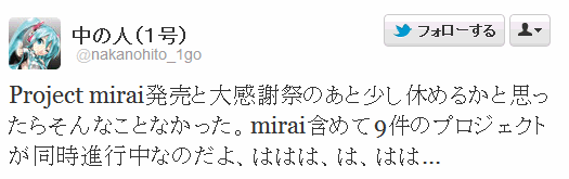 Project mirai発売と大感謝祭のあと少し休めるかと思ったらそんなことなかった。mirai含めて9件のプロジェクトが同時進行中なのだよ、ははは、は、はは…