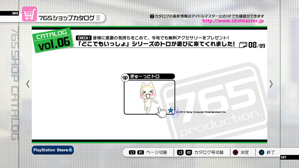 また,同じくPlayStation 3向けのカタログ第06号では,例によって無料アクセサリーのプレゼントが行われている。カタログをダウンロードするだけで手に入るお得な無料アクセ,今回はハンドアクセサリーの「ぎゅーっとトロ」だ。前回の無料アクセサリーが「ひな祭りカチューシャ」だったので,今回も何か季節に関係したものになるのかしらと思っていたところ,意外にもトロの出番というわけだ。