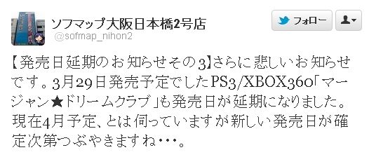 【発売日延期のお知らせその3】さらに悲しいお知らせです。3月29日発売予定でしたPS3/XBOX360「マージャン★ドリームクラブ」も発売日が延期になりました。現在4月予定、とは伺っていますが新しい発売日が確定次第つぶやきますね・・・。