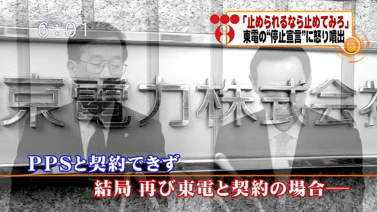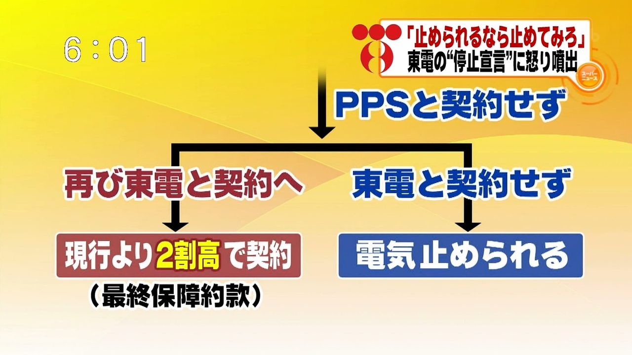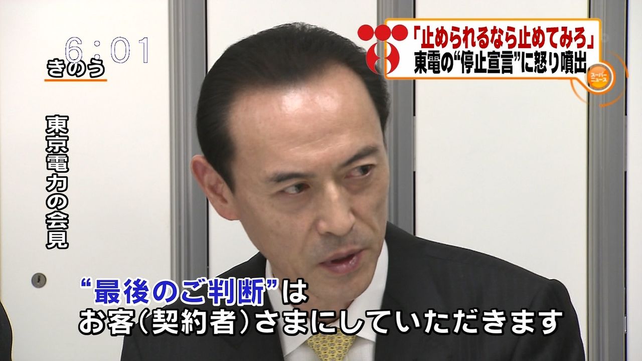 料金値上げは契約更新までは拒否できるが、値上げ通知に明記せず、「連絡がなければ了解」と見なして4月1日からの実施をもくろんでいた。東電はこの「だましうち」を認めたが、「契約切れから50日経ったら電気を止める。4月1日からだと最短で5月22日になります」と開き直った。