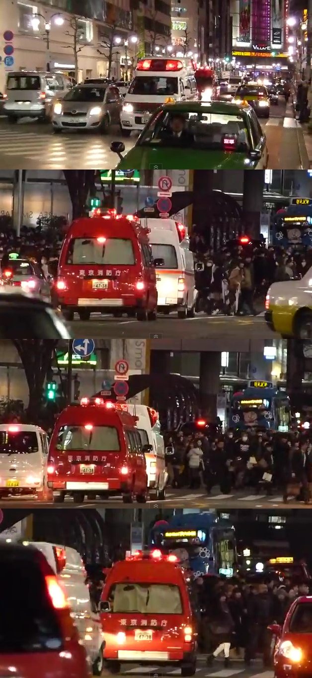 緊急走行で現場へ向う途中、スクランブル交差点で歩行者が進路を譲らず前走の救急車が停止。