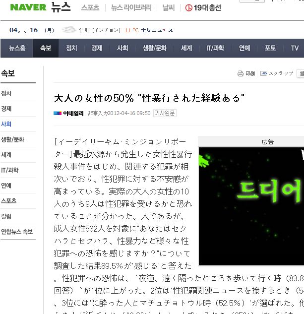 サラムイン(人と人=就職ポータルサイト)が成人女性532人を対象に「あなたは性醜行(性的虐待)および性戯弄(セクハラ)、性暴行など、各種性犯罪に対する恐怖を感じますか?」という問いに対して調査をした結果、89.5%が「感じる」と回答した。