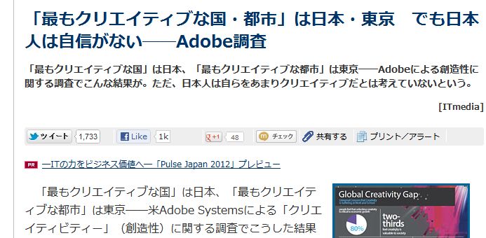 米Adobe Systemsによる「クリエイティビティー」(創造性)に関する調査でこうした結果が出た。日本は世界からクリエイティビティーを高く評価しているが、その日本人は自らをクリエイティブだとは考えていないという興味深い内容だ。