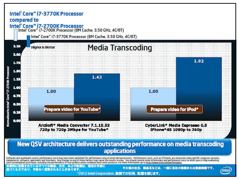 また、メディア処理の「Quick Sync Video」も2.0に強化され、トランスコード性能が最大で2倍に引き上げられた。なお、Ivy BridgeのQuick Sync Videoの性能を最大限に引き出すには、対応のSDKを利用してソフトウェアを最適化する必要があるが、従来のソフトでも性能は向上するという。このほか、対応ディスプレイ/チップセットとの組み合わせで、キーロガーなどによる、情報漏洩を防ぐ「Intel Identity Protection」技術を搭載する。