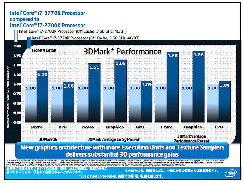 CPU コア周りのアーキテクチャに大きな変更はないが、グラフィックスについては「Intel HD Graphics 4000」へと進化。DirectX 11へ対応させたほか、シェーダユニット(Execution Unit)を12基から16基へと増強した。これにより、性能は70%以上強化された。