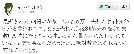 最近ちょっと納得いかないのは10万本売れたタイトルがヒットと言われてて、もっと売れた『428』が売れなくて失敗した事になっている事。