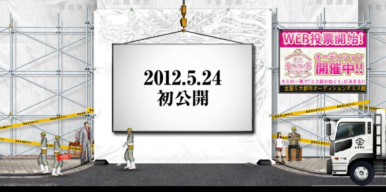 現在トップページでは、工事中の巨大フェンスと、せわしなく働く工事員の姿が見られる。そのフェンスの前にあるモニターには、『龍が如く』ナンバリングタイトルのロゴが順番に映し出され、最後に“2012.5.24 初公開”という文字が表示される。