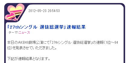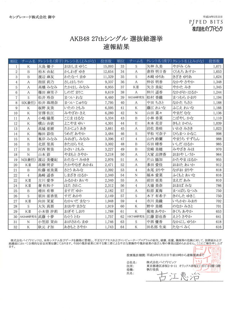 本日のAKB48劇場公演にて「27thシングル 選抜総選挙」の速報(1位〜64位)を発表させていただきました。