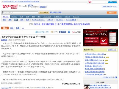 イオンPBチョコ菓子からアレルギー物質 (読売新聞) - Yahoo!ニュース