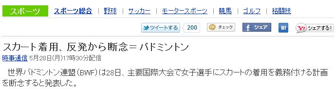 BWFは昨年、観客増、テレビ放映権、スポンサー収入などを考慮し女子選手にスカートやワンピースタイプのユニホームの着用を義務付ける計画を発表した。しかし、中国やインド、インドネシア、マレーシアから同計画への反発が高まり、ロンドン五輪での混乱を避けるため断念した。