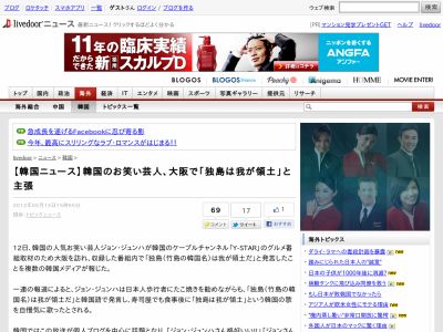 ・12日、韓国の人気お笑い芸人ジョン・ジュンハが韓国のケーブルチャンネル「Y-STAR」のグルメ番組取材のため大阪を訪れ、収録した番組内で「独島(竹島の韓国名)は我が領土だ」と発言したことを複数の韓国メディアが報じた。