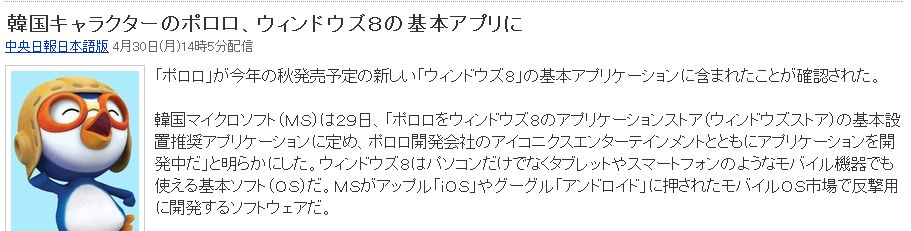 韓国マイクロソフト(MS)は29日、「ポロロをウィンドウズ8のアプリケーションストア(ウィンドウズストア)の基本設置推奨アプリケーションに定め、ポロロ開発会社のアイコニクスエンターテインメントとともにアプリケーションを開発中だ」と明らかにした。