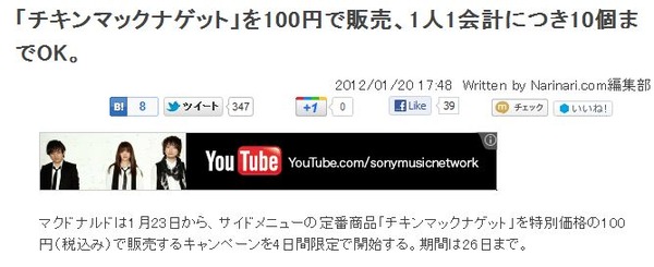 「チキンマックナゲット」を100円で販売、1人1会計につき10個までOK。