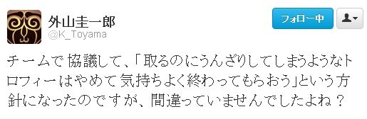 チームで協議して、「取るのにうんざりしてしまうようなトロフィーはやめて気持ちよく終わってもらおう」という方針になったのですが、間違っていませんでしたよね?