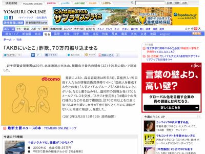 「AKBにいとこ」詐欺、70万円振り込ませる
