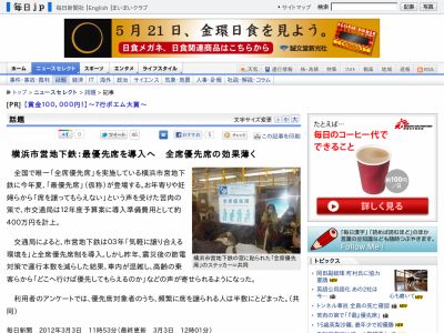 交通局によると、市営地下鉄は03年「気軽に譲り合える環境を」と全席優先席制を導入。しかし昨年、震災後の節電対策で運行本数を減らした結果、車内が混雑し、高齢の乗客らから「どこへ行けば優先してもらえるのか」などの声が寄せられるようになった。