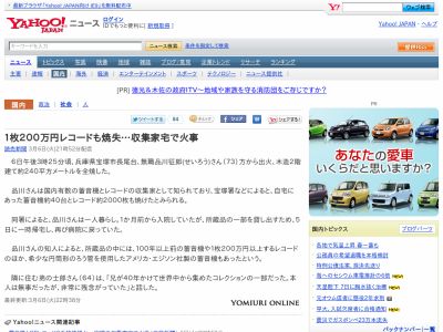 6日午後3時25分頃、兵庫県宝塚市長尾台、無職品川征郎(せいろう)さん(73)方から出火、木造2階建て約240平方メートルを全焼した。品川さんは国内有数の蓄音機とレコードの収集家として知られ、宝塚署などによると、自宅にあった蓄音機約40台とレコード約2000枚も焼けたとみられる。